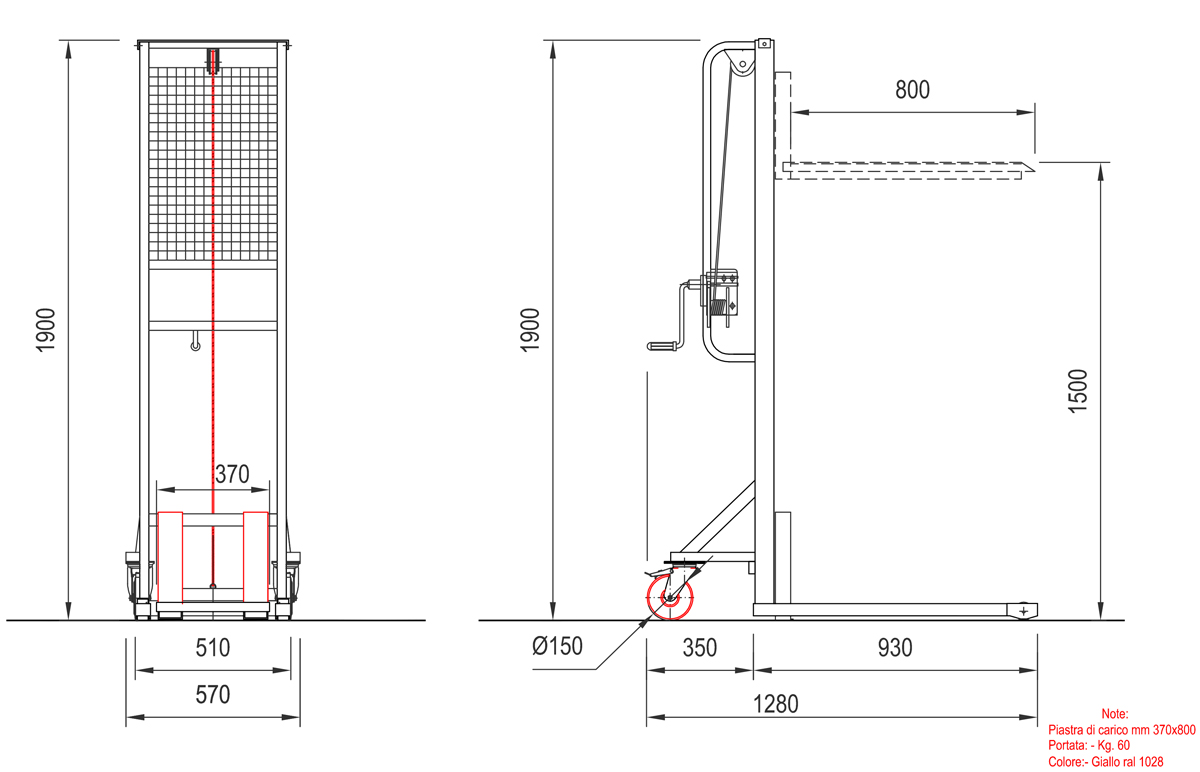 Hand winch stacker capacity 80Kg lifting height 1,50 mt.