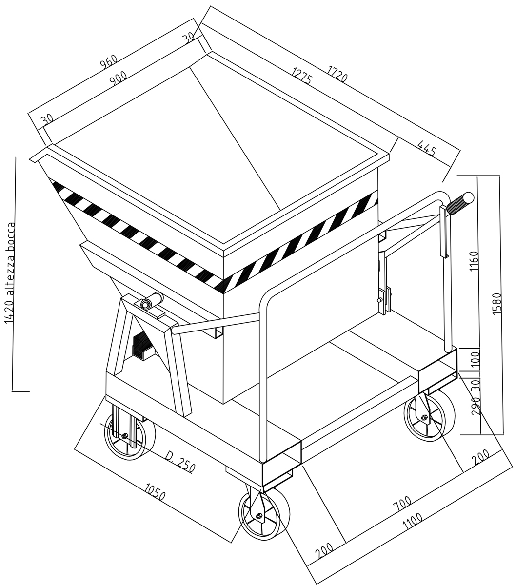 La benna è costruita con tubolari e lamiere d'acciaio, dimensionata, come le ruote, in funzione della portata. Ha due ammortizzatori in gomma per attutire gli urti di rotazione. E' da utilizzare per il recupero e il trasporto di qualsiasi scarto di lavorazione di materiali sfusi o agglomerati. La vasca può essere saldata a tenuta stagna per impedire lo scolo di liquidi in fase di movimentazione. Le due ruote fisse e le due ruote girevoli, montate su cuscinetti a sfere, consentono un'agevole movimentazione manuale. La benna è dotata di inforcamenti; la leva di comando permette iuna facile rotazione a 120° con fuoriuscita graduale del contenuto; l'operatore può non scendere dal carrello elevatore per compiere questa operazione.