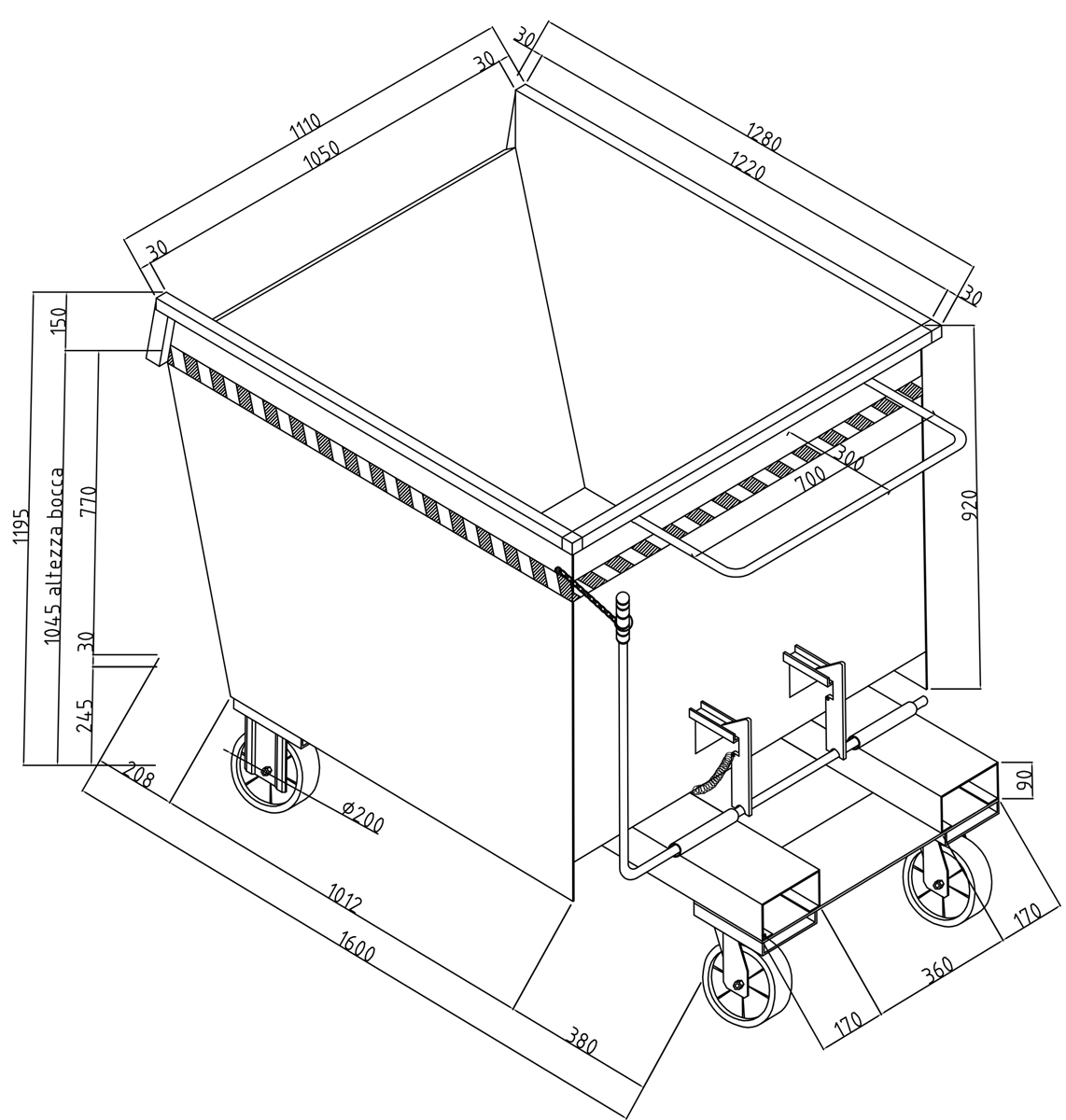 La benna è costruita con tubolari e lamiere d'acciaio, dimensionata, come le ruote, in funzione della portata. E' particolarmente adatta ad essere affiancata a macchine operatrici tipo torni, frese, presse, ecc. per il recupero e il trasporto degli scarti di produzione. La vasca a tenuta stagna impedisce gli scoli dei liquidi in fase di movimentazione. Ha due ganci di fermo e due ammortizzatori in gomma per assorbire gli urti del ribaltamento. Le due ruote fisse e le due ruote girevoli in Vulkolan, montate su cuscinetti a sfere, consentono un'agevole movimentazione manuale. Gli inforcamenti con snodo terminale permettono una facile rotazione a 160° della benna con una fuoriscita totale del contenuto; l'operatore può non scendere dal carrello elevatore per compiere questa operazione.