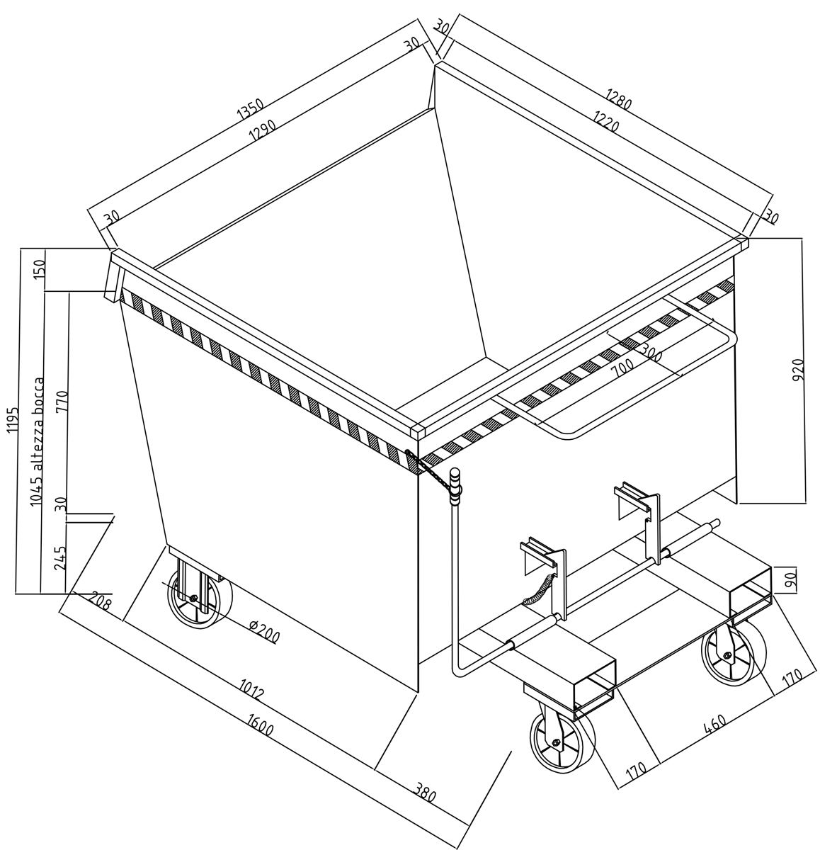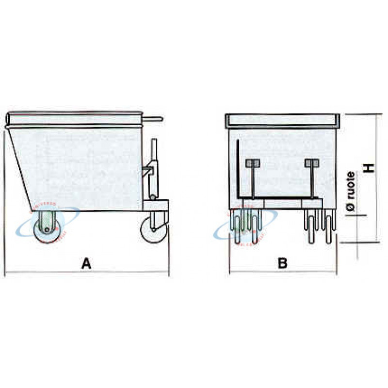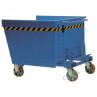 La benna è costruita con tubolari e lamiere d'acciaio, dimensionata, come le ruote, in funzione della portata. E' particolarmente adatta ad essere affiancata a macchine operatrici tipo torni, frese, presse, ecc. per il recupero e il trasporto degli scarti di produzione. La vasca a tenuta stagna impedisce gli scoli dei liquidi in fase di movimentazione. Ha due ganci di fermo e due ammortizzatori in gomma per assorbire gli urti del ribaltamento. Le due ruote fisse e le due ruote girevoli in Vulkolan, montate su cuscinetti a sfere, consentono un'agevole movimentazione manuale. Gli inforcamenti con snodo terminale permettono una facile rotazione a 160° della benna con una fuoriscita totale del contenuto; l'operatore può non scendere dal carrello elevatore per compiere questa operazione.