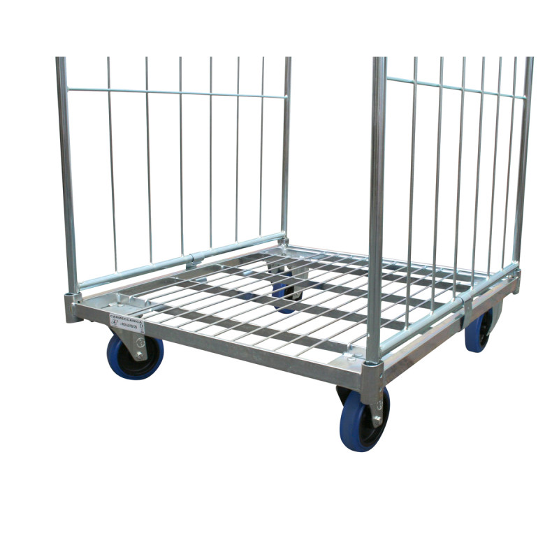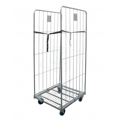 Robust roll container with high mesh walls.