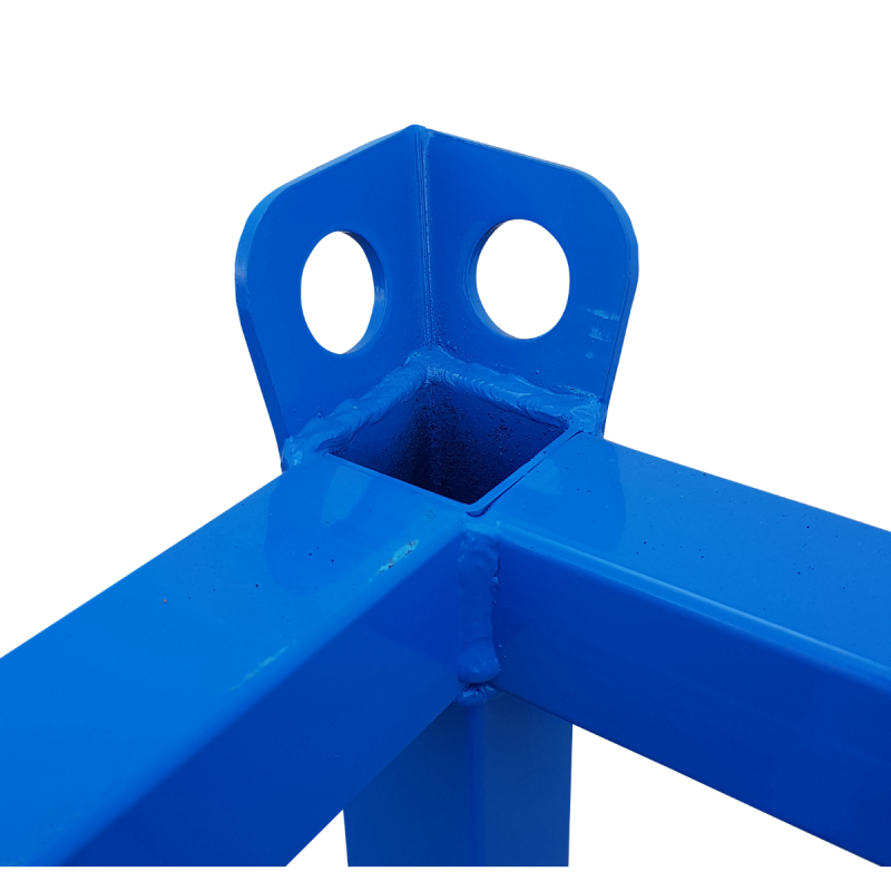 Per contenitori, pallet e bancali EUR (1200 x 800 mm). I quattro angoli di ritenuta con occhielli di sollevamento fissano i prodotti da trasportare e i bancali in modo sicuro al carrello.