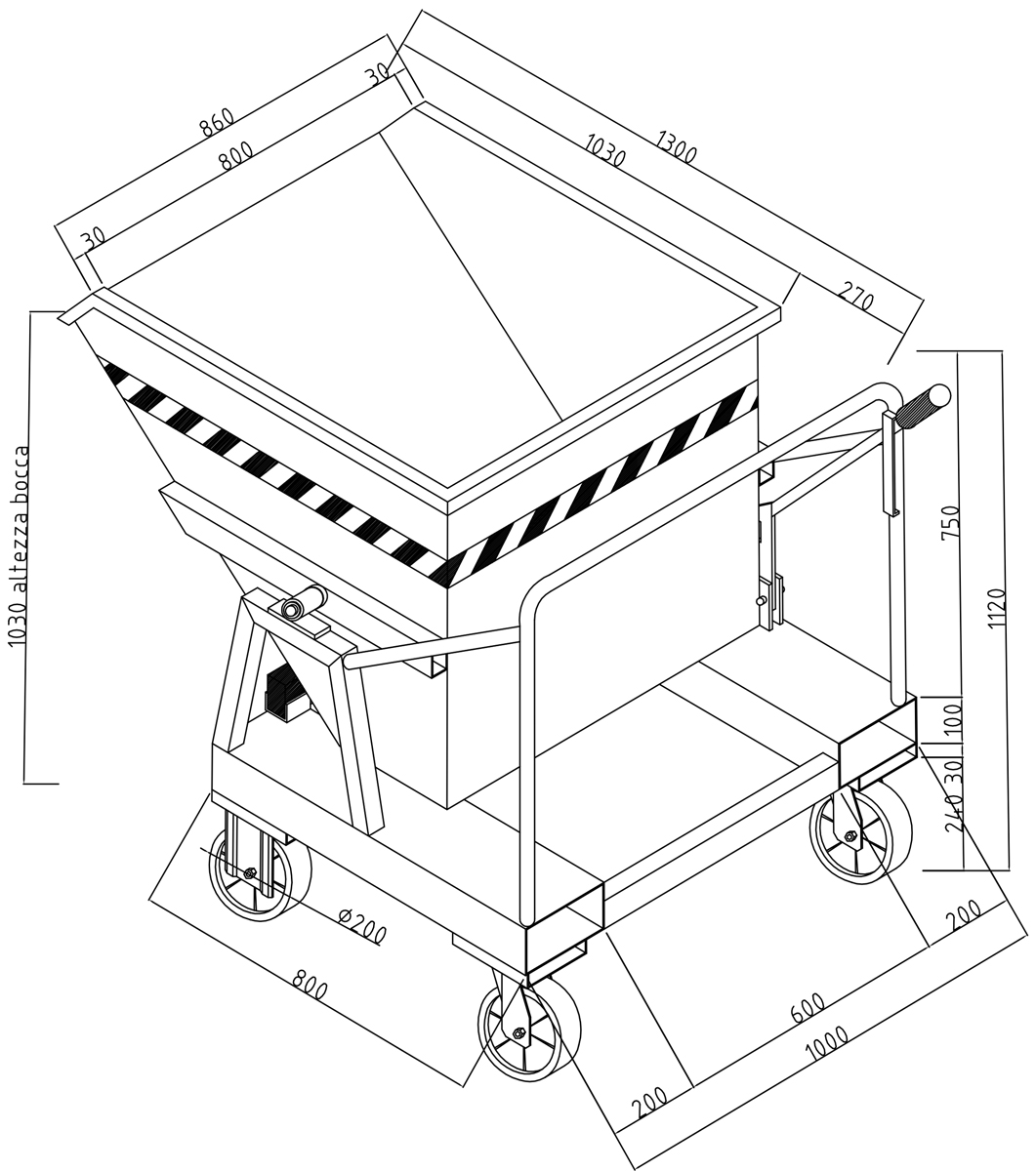 La benna è costruita con tubolari e lamiere d'acciaio, dimensionata, come le ruote, in funzione della portata. Ha due ammortizzatori in gomma per attutire gli urti di rotazione. E' da utilizzare per il recupero e il trasporto di qualsiasi scarto di lavorazione di materiali sfusi o agglomerati.La vasca è saldata a tenuta stagna per impedire lo scolo di liquidi in fase di movimentazione.Le due ruote fisse e le due ruote girevoli, montate su cuscinetti a sfere, consentono un'agevole movimentazione manuale. La benna è dotata di inforcamenti; la leva di comando permette iuna facile rotazione a 120° con fuoriuscita graduale del contenuto; l'operatore può non scendere da carrrello elevatore per compiere questa operazione.