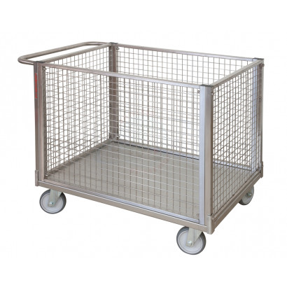 Carrello contenitore con piano in lamiera inox e 4 sponde in rete in acciaio inox