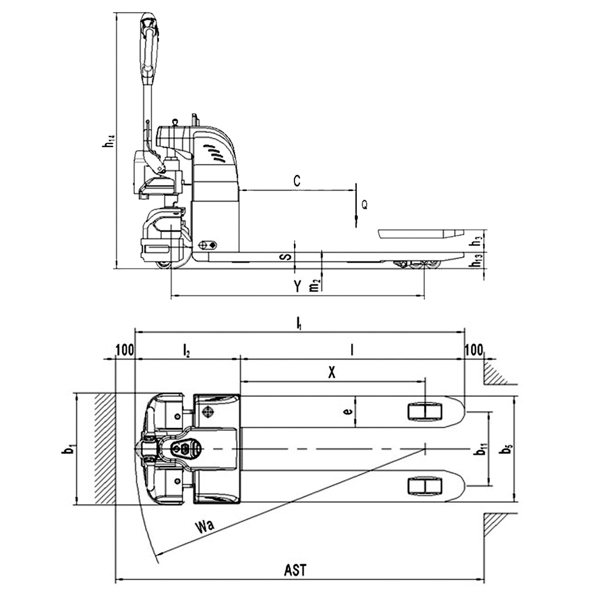 Il sollevamento avviene agendo sul timone come in un transpallet manuale.